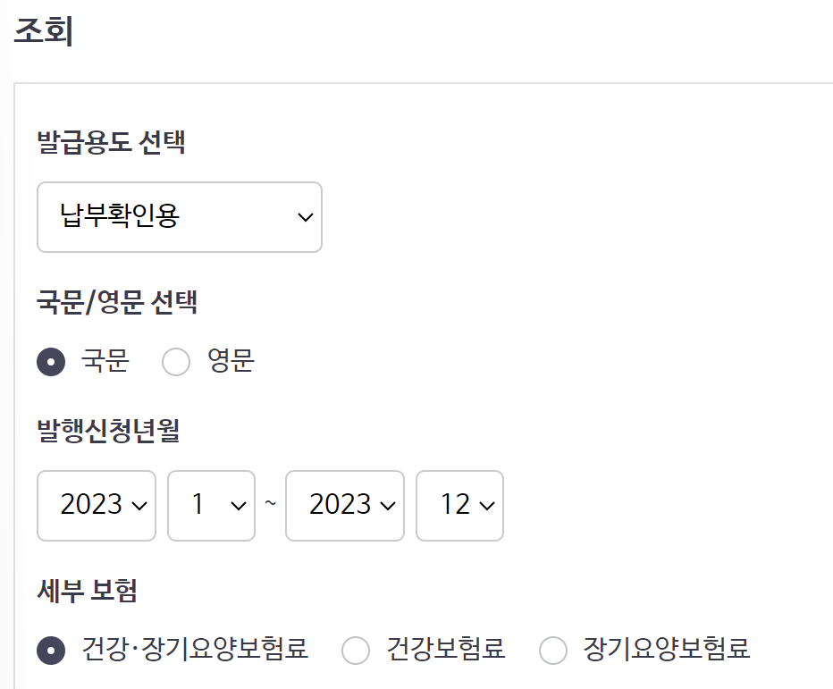 국민 또는 영문으로 선택이 가능하며 발행 신청년월을 선택 한 다음 세부 보험을 선택합니다.