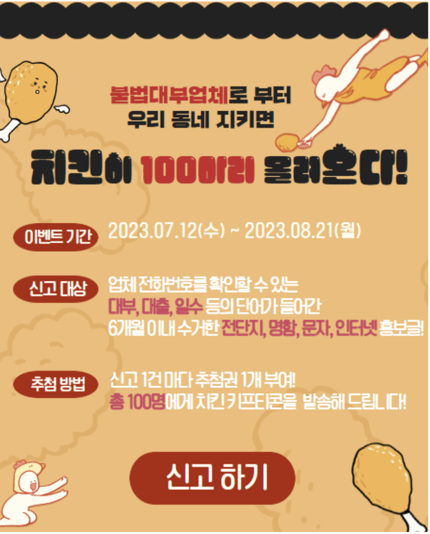 서민금융진흥원에서 불법대부대출광고에 사용된 전화번호를 신고하면 신고 1건 마다 추첨권을 1개 부여하여 총 100명에게 치킨 기프티콘을 드린다고 합니당
