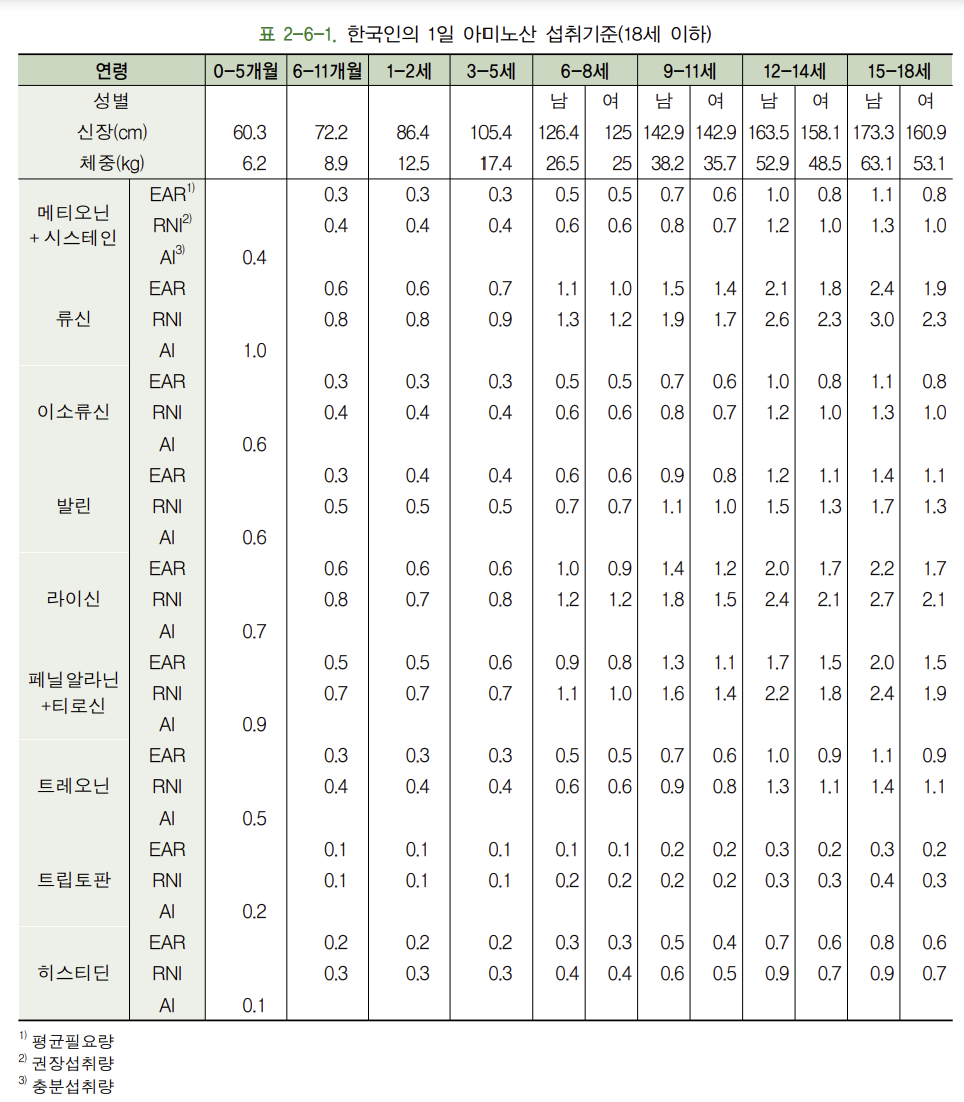 아미노산 한국인 기준 1일 섭취기준은 아래 표를 참고 하시면 됩니다.