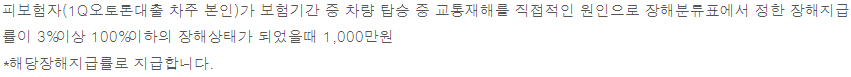 만일 하나은행으로부터 1Q오토론을 이용하여 자동차를 구매한 고객이라면 대출실행일로부터 1년 이내에 아래 조건에 해당하는 본인 신체 상해가 발생한 경우 보험혜택을 제공합니다.