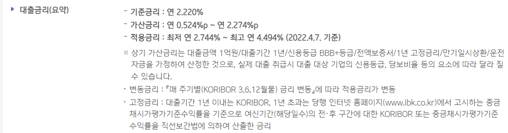 대출금리(요약) 기준금리 : 연 2.220% 가산금리 : 연 0.524%p ~ 연 2.274%p 적용금리 : 최저 연 2.744% ~ 최고 연 4.494% (2022.4.7. 기준) 상기 가산금리는 대출금액 1억원/대출기간 1년/신용등급 BBB+등급/전액보