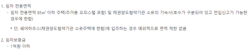 - 쉐어하우스에 입주하는 경우 채권양도협약기관 소유주택에 한해 예외적으로 세대주 요건을 충족하지 않더라도 이용 가능
