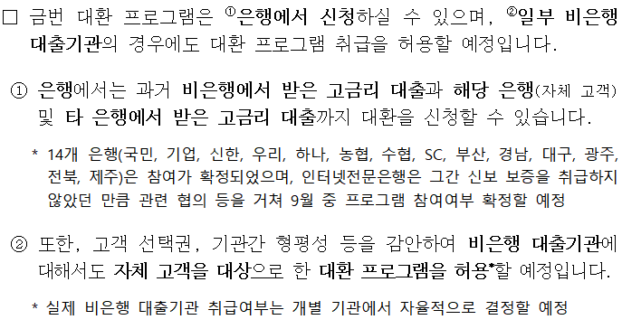 코로나 19를 극복하고 있는 과정에서 자영업자 및 소상공인의 대출이 계속 증가됨에 따라 상환 부담이 늘어나고 비은행권을 중심으로 고금리 대출이 늘어나는 등 많이 힘들어 하실 자영업자 및 소상공인분들을 위해 금융위원회에서 대환대출 프로그램을 마련했습니다.