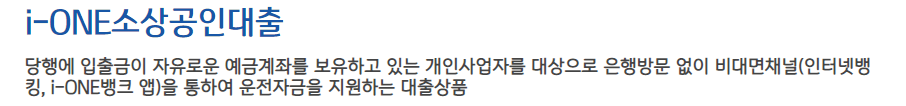이 상품은 기업은행에 입출금이 자유로운 예금 계좌를 보유하고 있는 개인사업자를 대상으로 은행 방문 없이 비대면 채널인(인터넷뱅킹 및 i-ONE뱅크 앱)을 통하여 운영에 있어 필요한 운전 자금을 지원하는 대출 상품입니다.