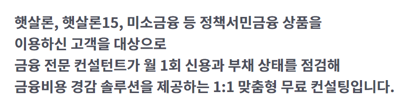 햇살론, 햇살론15, 미소금융 등 정책서민금융 상품을 이용하신 고객을 대상으로 금융 전문 컨설턴트가 월 1회 신용과 부채 상태를 점검해 금융비용 경감 솔루션을 제공하는 1:1 맞춤형 무료 컨설