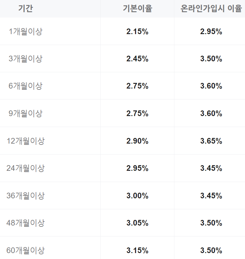 가입기간은 1개월 이상 60개월 이하로 만기일은 1일 단위로 설정이 가능하고 가입기간 별 금리는 아래와 같습니다.