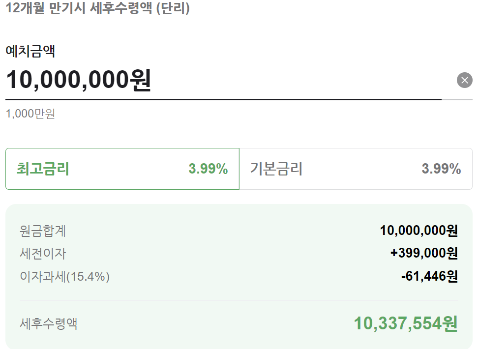 가입기간은 1년이며 가입금액은 100만원 이상 1천만원 이하로 가입이 가능하며, 기본금리가 최고금리인 상품입니다.