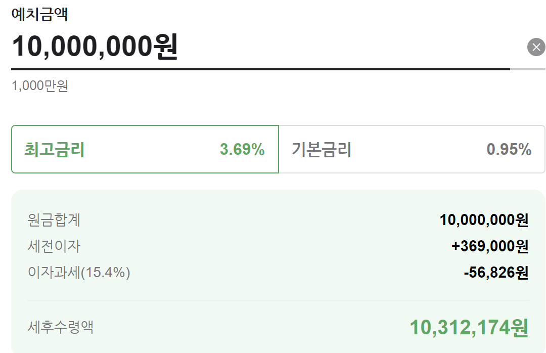 이 상품 예치금액 1천만원 12개월 만기 시 예상 이자 세후 수령액은 아래와 같습니다.