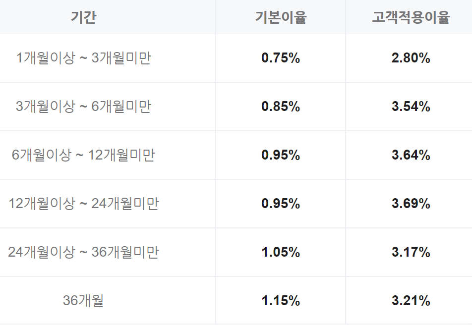 가입기간은 1개월 이상 36개월 이하로 만기일은 월 단위로 지정이 가능하며 가입기간에 따른 금리는 다음과 같습니다.