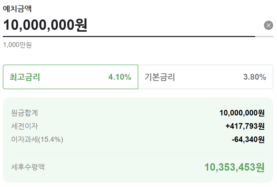 이 상품 1천만원 12개월 만기 가입 시 예상 세후 수령액은 다음과 같습니다.