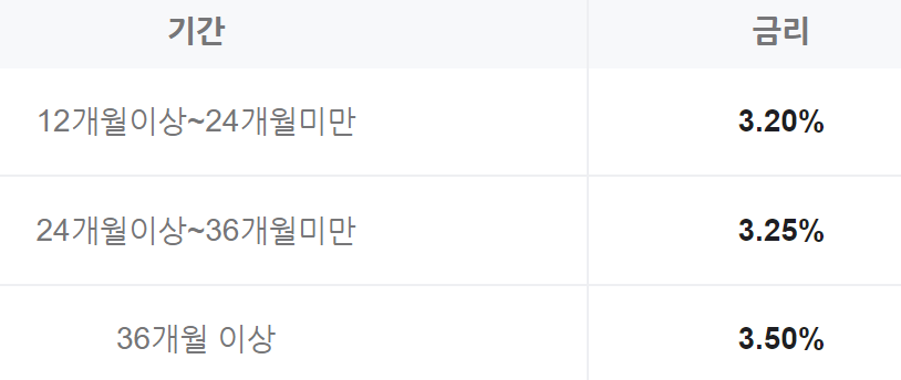 가입기간은 12개월 이상 36개월 이내로 가입기간 별 금리는 아래와 같으니 참고 하시길 바랍니다.