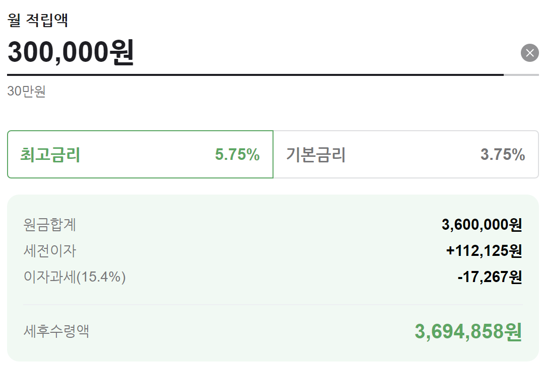 이 상품 30만원 12개월 정액적립식 만기 시 세후 예상 수령액은 아래와 같습니다.