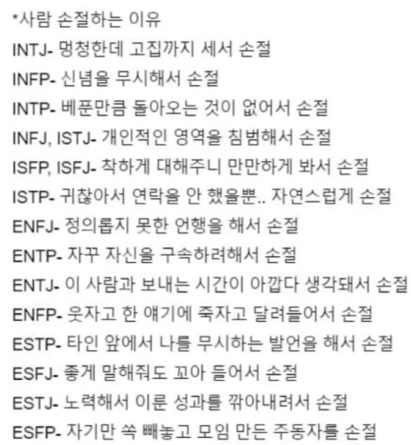 - 고집스럽고 비협조적이다. T 유형은 자신의 의견이나 결정에 대해 확신을 가지고 있기 때문에, 다른 사람들의 의견이나 제안을 받아들이거나 수용하기 어려울 수 있다. 또한, 타협이나 협조보다는 자신의 방식대로 일을 하려고 하기 때문에, 팀워크나 협력이 필요한 상황에서 어려움을 겪을 수 있다.