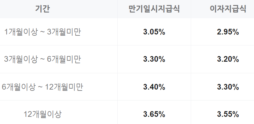 이 상품도 누구나 방문 없이 가입 가능한 상품으로 가입기간은 12개월 이상 36개월 이내로 만기일은 월 단위로 지정이 가능하며 가입기간, 이자지급방식에 따른 금리 차이는 다음과 같습니다.