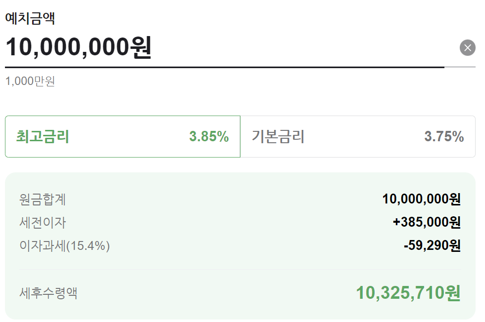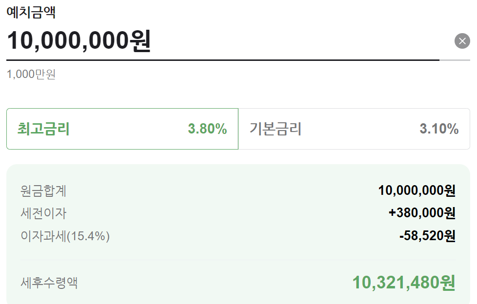 가입한도는 100만원 이상부터 따로 가입한도에는 제한이 없이 가입이 가능하며 이 상품 12개월 만기 1천만원 예치 시 세후 수령액은 다음과 같습니다.