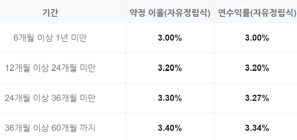 - 자동이체 우대이율 : 이 예금의 만기 시 이 예금으로 5회 이상 자동이체가 이루어진 경우에는 추가금리 적용 : 0.1%