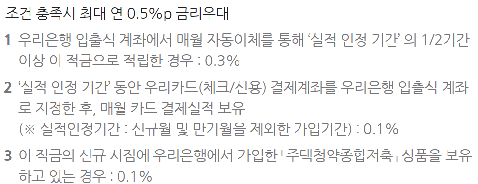 또한 이 상품은 우대금리가 존재하는데 우대금리 조건은 다음과 같습니다.