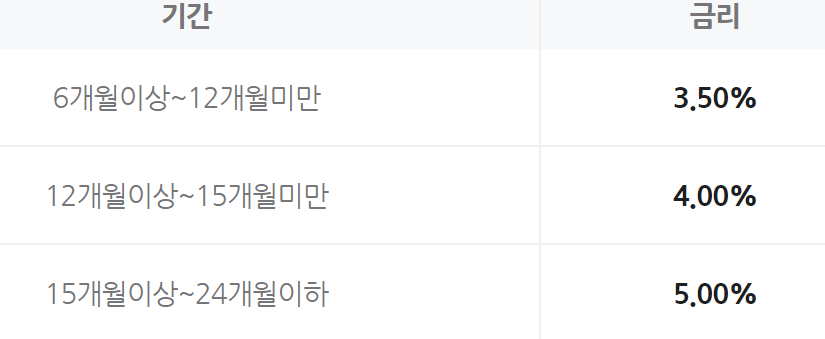 우선 가입기간은 6개월에서 24개월로 만기일은 전역예정일을 기준으로 하며 , 전역 시 적금도 해지되며 가입기간에 따른 금리는 다음과 같습니다.