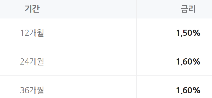 이 상품은 가입기간이 1년, 2년, 3년이 있으며 가입기간에 따른 금리는 다음과 같습니다.