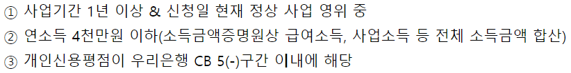 대출 조건은 아래의 조건을 모두 충족하는 개인사업자라면 가능합니다.