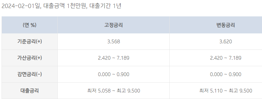 위 대출금리는 예시 금리로 최저금리 ~ 최고금리 선에서 결정되며, 신청자분의 조신용 조건 및 시장금리 등에 따라 달라집니다.