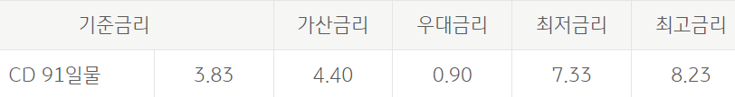 대출금리는 신용등급 3등급, 대출기간 2년 미만을 기준으로 한 예시 금리로 실제 적용 금리는 대출 및 신용 조건 등에 따라 달라질 수 있습니다.