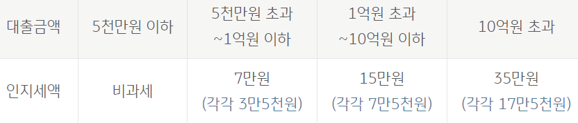 인지세란 대출거래 약정 시 내는 세금으로 아래 대출금액에 따라 인지세는 차등적용되며 은행과 고객이 반반씩 부담하게 됩니다.