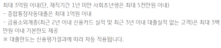 위의 대출금리는 신용등급 3등급을 기준으로 한 예시 금리이며 실제 적용 금리는 신청자분의 신용 조건 등에 따라 달라질 수 있습니다.