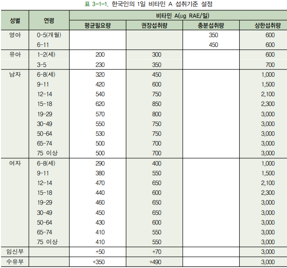 - 여자: 6~8세는 400mcgRE, 9~11세는 550mcgRE, 12~49세는 650mcgRE, 50세 이상은 600mcgRE