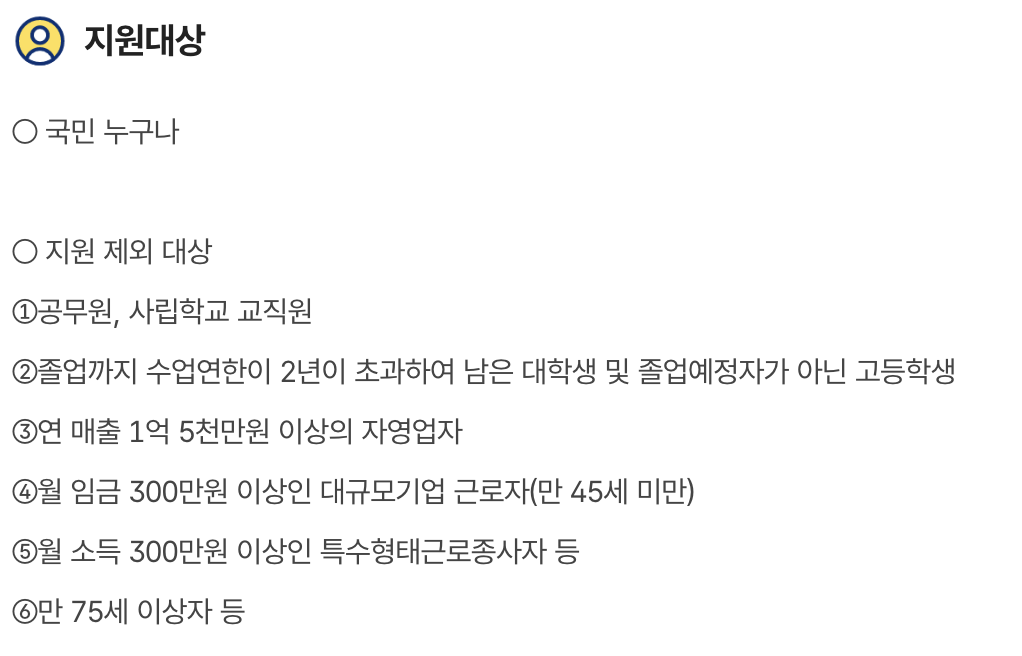이외에도 대학생은 신청 가능하지만 졸업까지 2년 이상 남았다면 발급이 제한될 수 있습니다. 구체적인 기준은 신청 시 고용센터나 온라인 신청 시스템을 통해 확인 가능합니다.