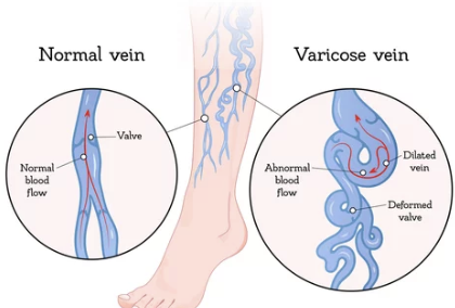 - 정맥의 판막 기능 이상으로 혈액이 아래로 고이는 상태